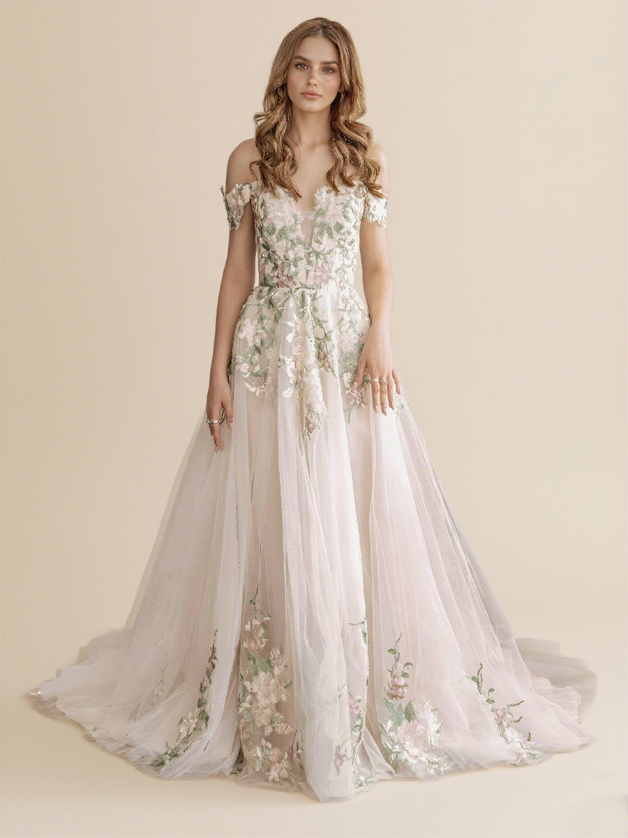 Elegant Aline Colorful Lace Wedding Dress Off the Shoulder Sleeves Flowy Outdoor Boho Wedding Gown