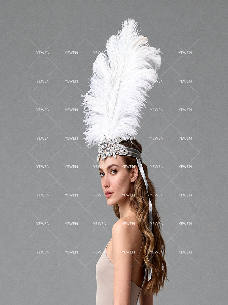 White Feather Gatsby Headpiece with Rhinestones Bridal Headband Hair Accessories for Wedding Photography YW2603112D