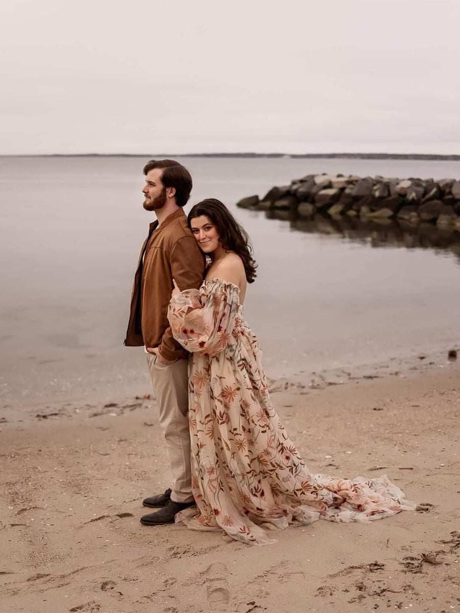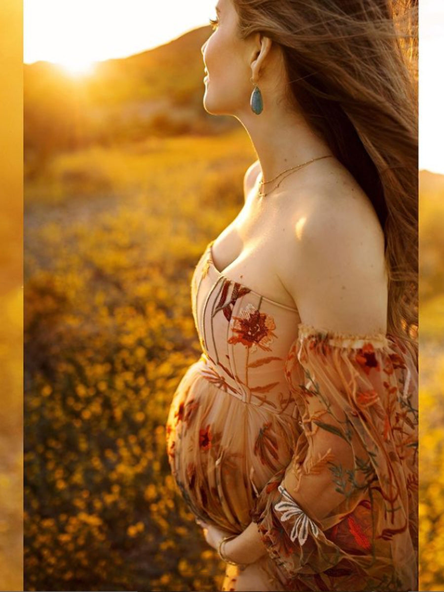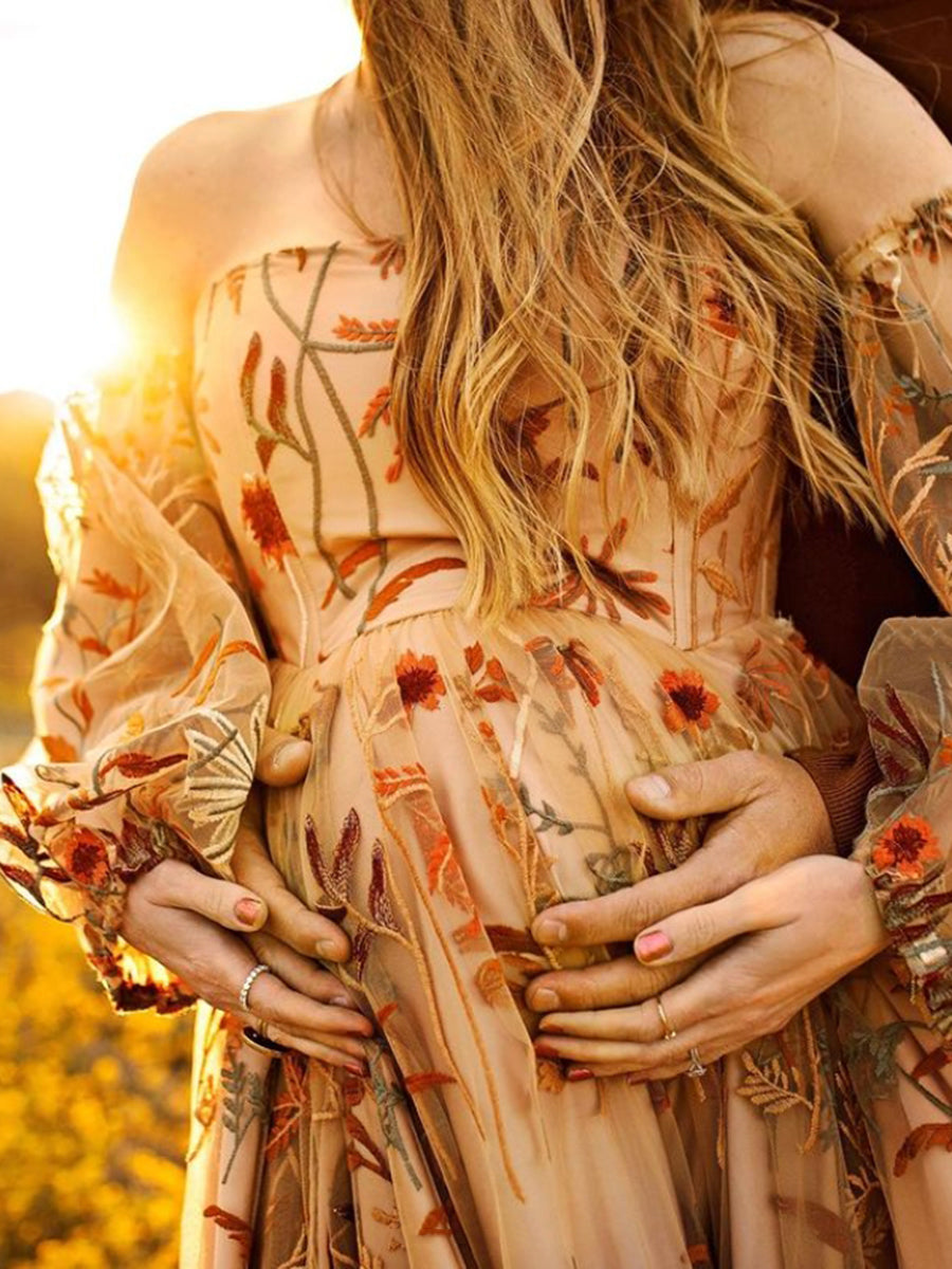 Off Shoulder Long Sleeve Embroidery Lace Colored Wedding Dress Photo Shoot Dress YW230320