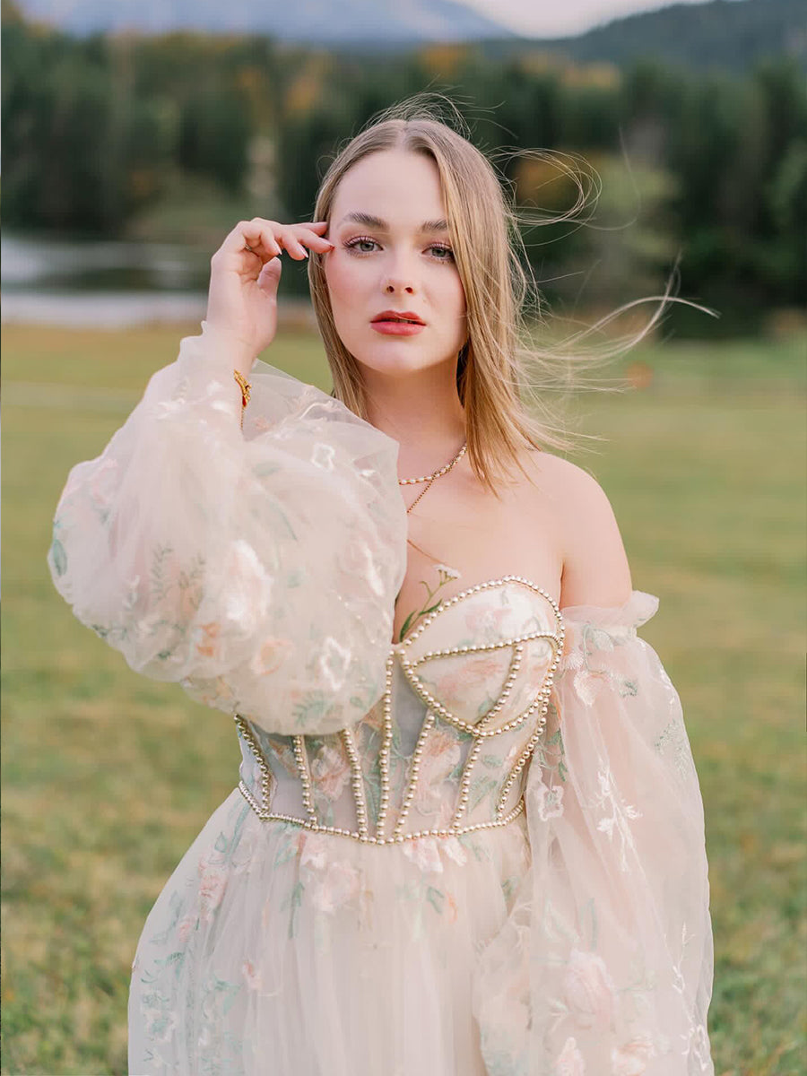 Strapless Long Sleeves Embroidery Floral Wedding Dresses with Color Beading Pearls Dress Photo Shoots Gowns YW230306