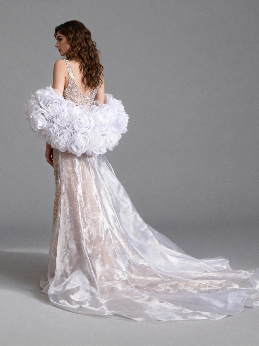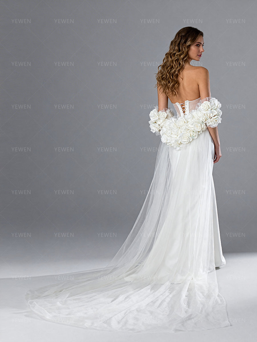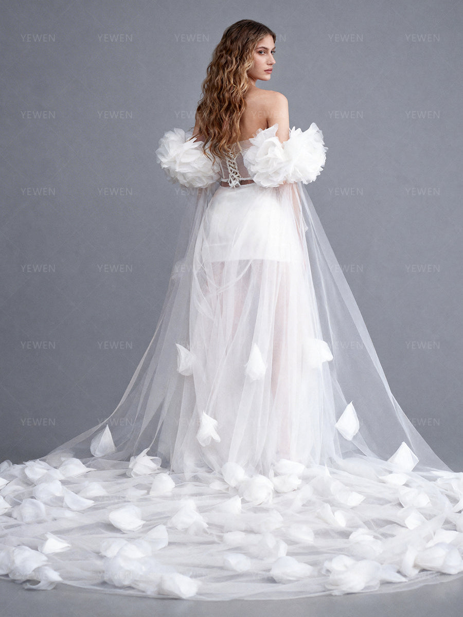 Bridal Tulle Cape with Handmade Flowers Detachable Wedding Cape Train with sleeves Romantic Lightweight Bridal Accessory