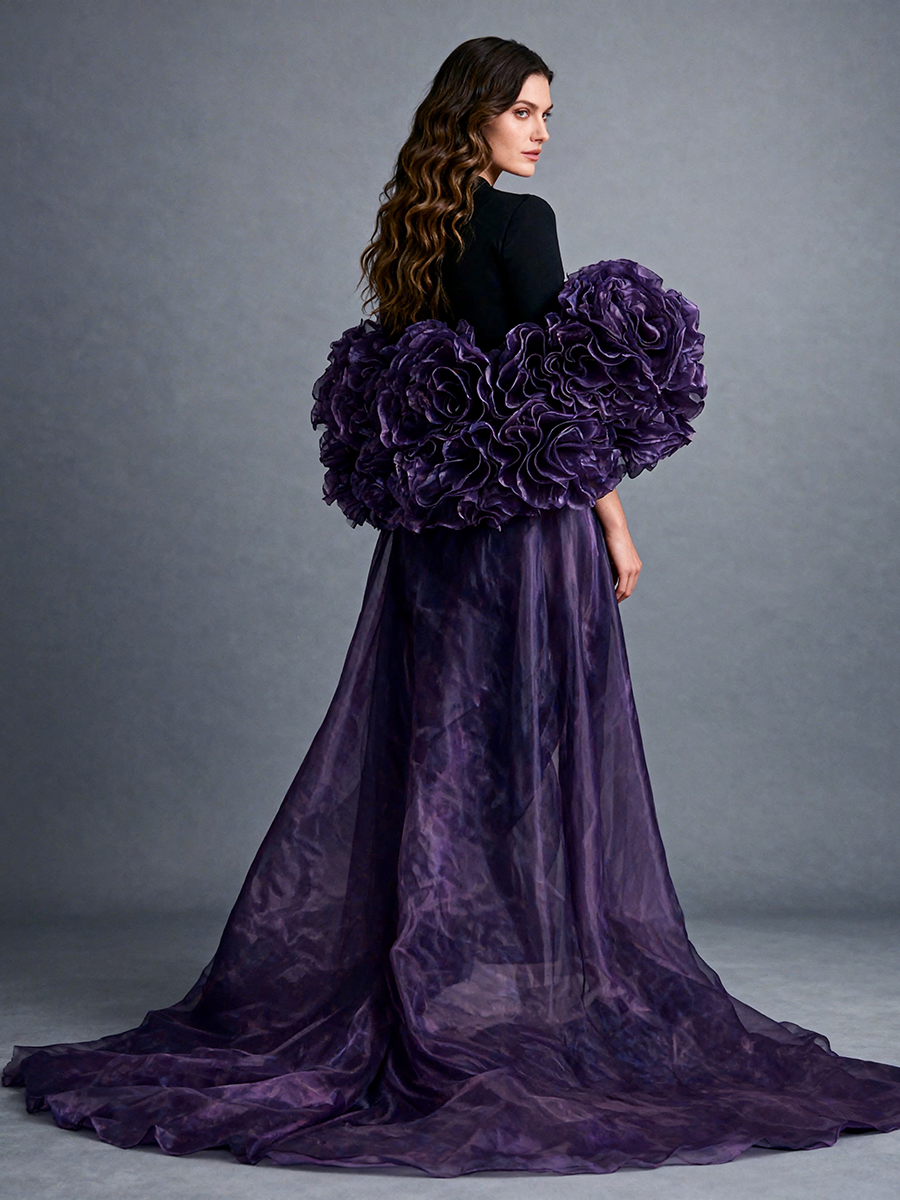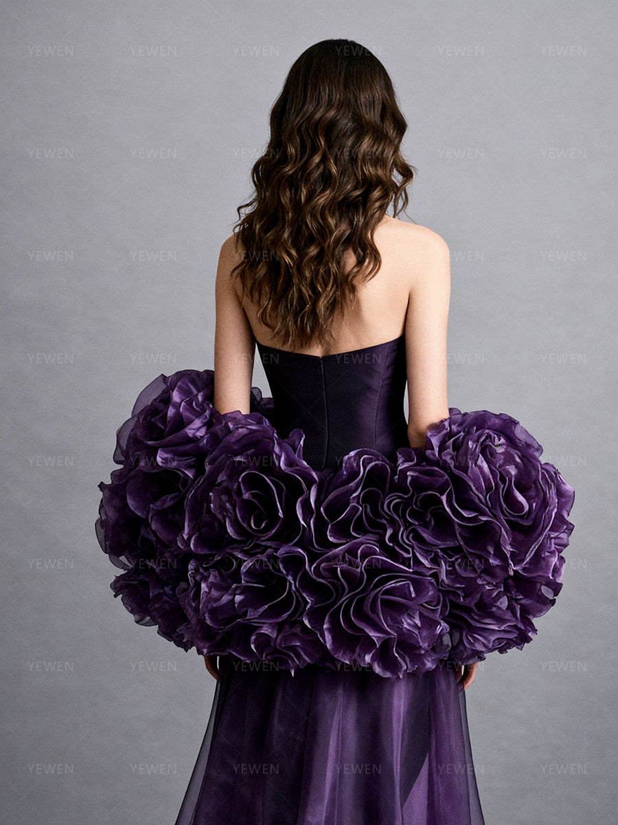 Purple Bridal Organza Cape with Handmade Flowers Detachable Wedding Cape Train Romantic Lightweight Bridal Accessory