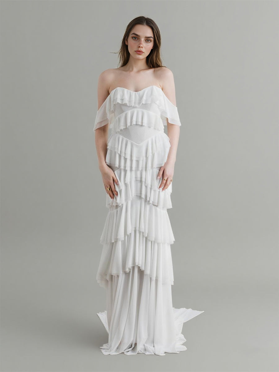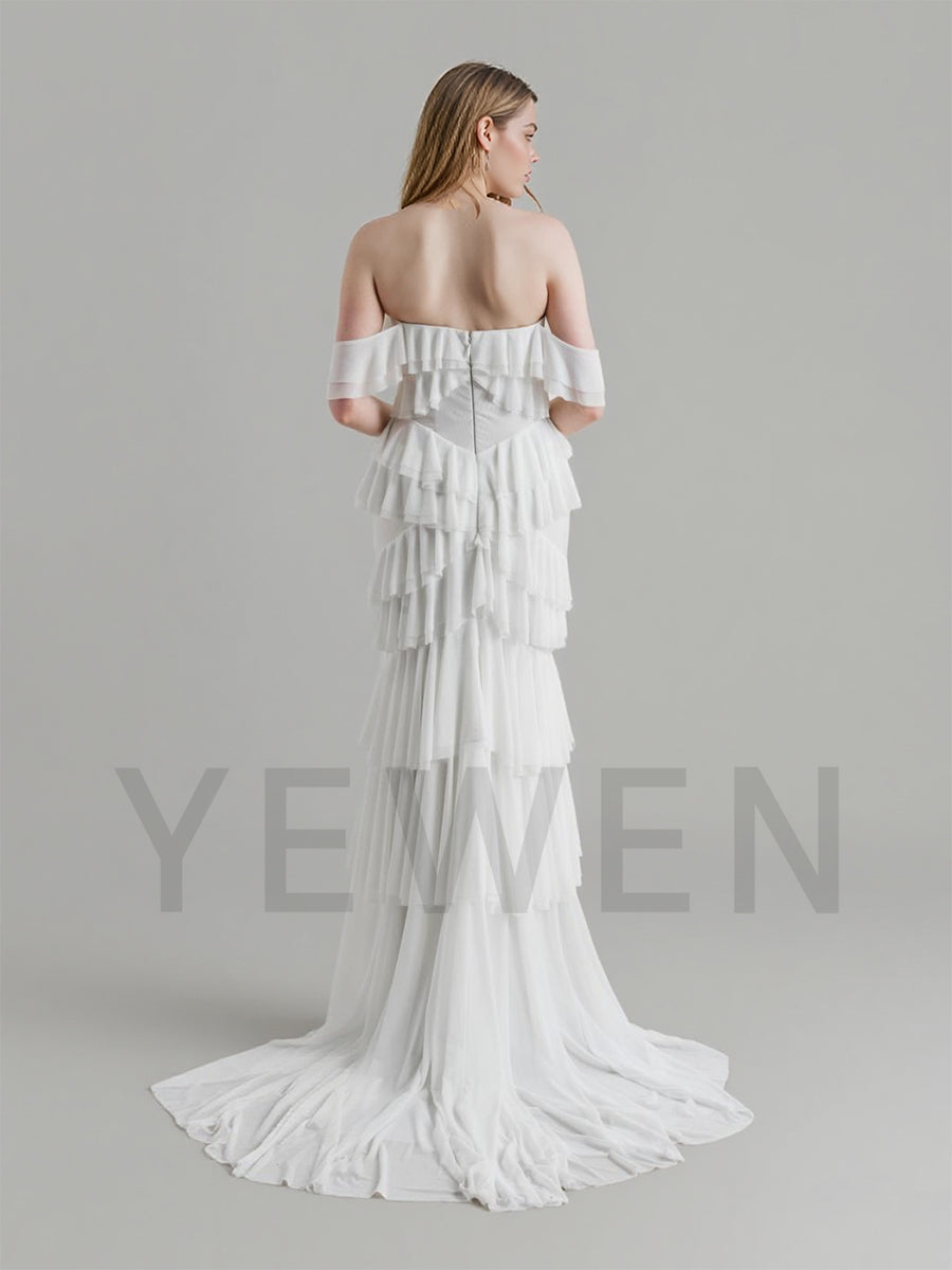 Ivory Chiffon Party Dresses Strapless Layer Ruffles Evening Prom Dress Floor Length