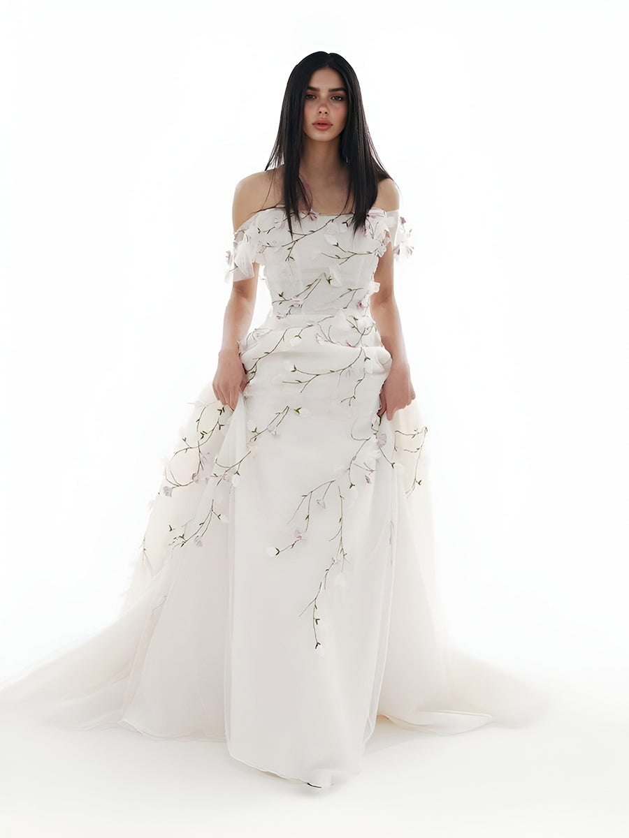 Floral Embroidered Evening Dress Garden Party Formal Gown Puffy Sleeves
